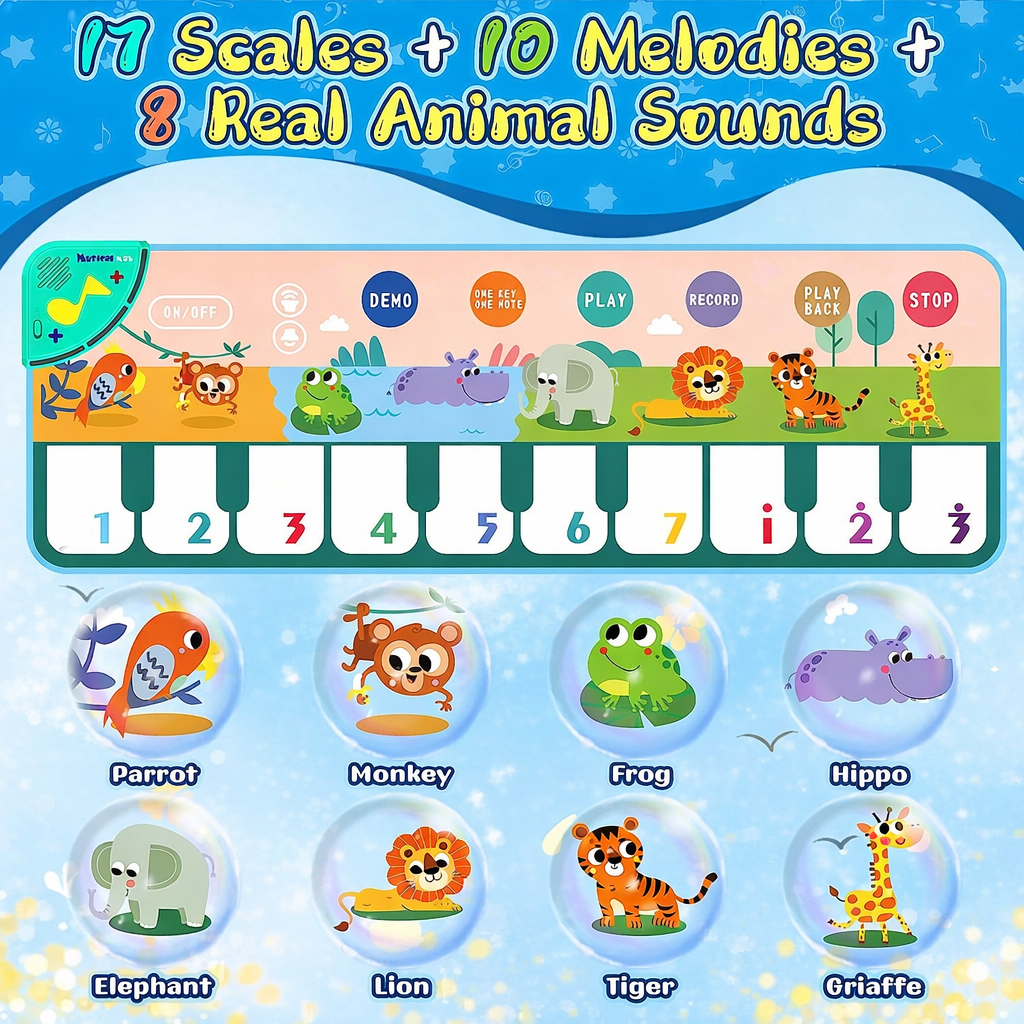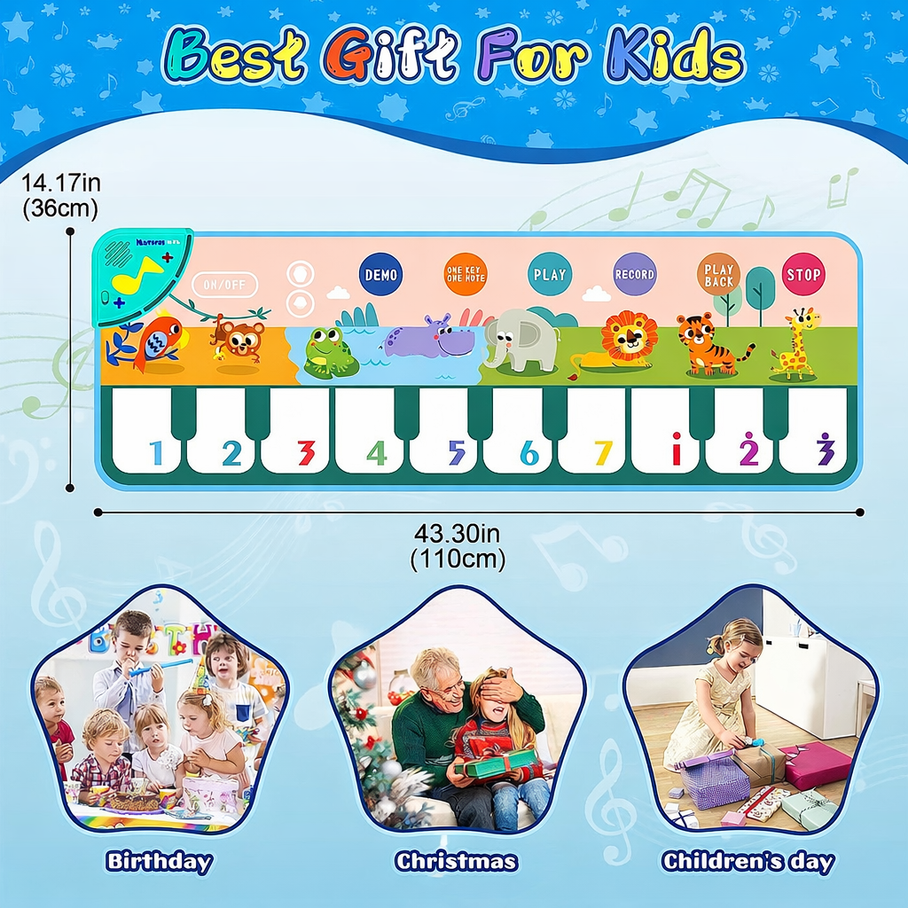 Transformă joaca într-o experiență educativă și distractivă cu pianul muzical pentru copii, conceput special pentru dezvoltarea creativității și a simțurilor celor mici. Cu un design colorat, personaje vesele și funcții interactive, acest covoraș muzical este ideal pentru copii mici și preșcolari.