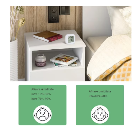 Acest termometru higrometru portabil masoara umiditatea si temperatura din interior si va ajuta sa cunoasteti conditiile aerului din incapere. Alegerea ideala pentru viata personala si profesionala.
