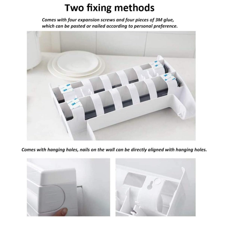 SUPORT DE PROSOAPE DE HARTIE MONTAT PE PERETE: Suport de prosoape de hartie de montare pe perete care economiseste spatiu, cu distribuitoare incorporate pentru folie de plastic si folie de aluminiu cu spatiu deasupra pentru condimente. Suport de organizare de bucatarie esential pentru o casa moderna.